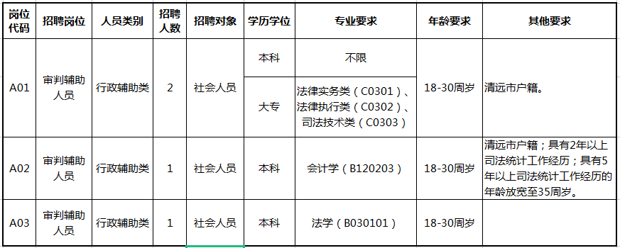 根據(jù)工作需要,清遠(yuǎn)市清城區(qū)人民法院現(xiàn)面向社會公開招聘專項(xiàng)工作聘員4名。具體崗位設(shè)置如下: