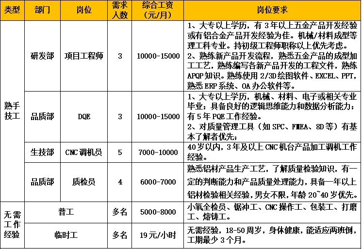 公司擁有廣東省唯一的鋁車體工程技術研究中心!扳伱冷X材”品牌先后獲得鋁型材行業(yè)內(nèi)的最高榮譽:“中國馳名商標”、“中國著名品牌”、“中國名優(yōu)產(chǎn)品”;公司榮獲“國家高新技術企業(yè)”、廣東省“專精特新”企業(yè)等榮譽稱號。因生產(chǎn)發(fā)展需要,誠聘以下崗位: